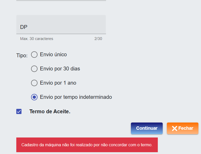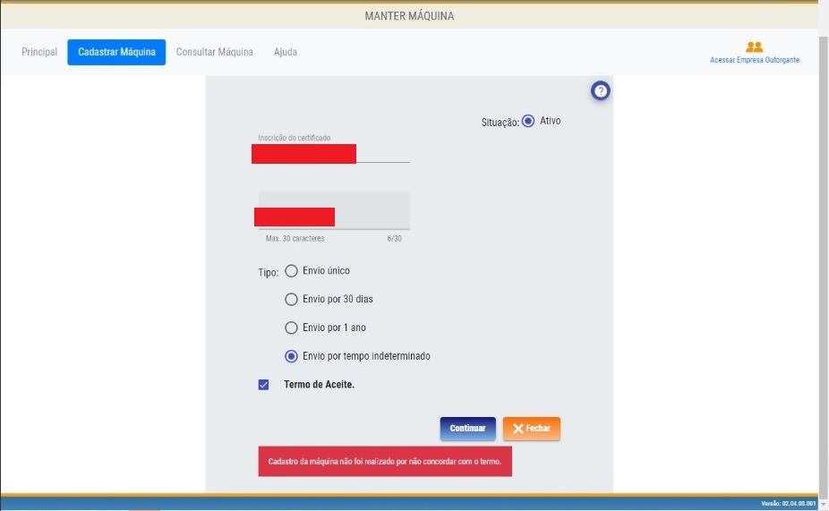 RAYARA CADASTRO DE MAQUINA NÃO FOI REALIZADO POR NÃO CONCORDAR COM O TERMO por RAYARA Conectividade Social Bom dia!Estou tentando cadastrar a máquina no conectividade social e apesar de concordar com os termos apresenta essa mensagem. Compartilhe: Postado há 2 anos 0 4592